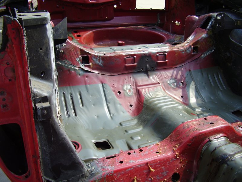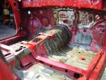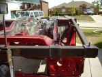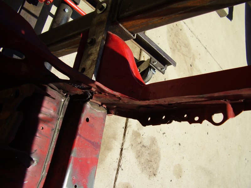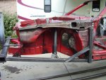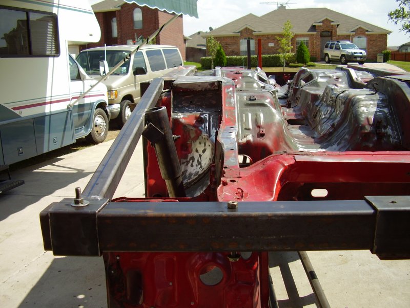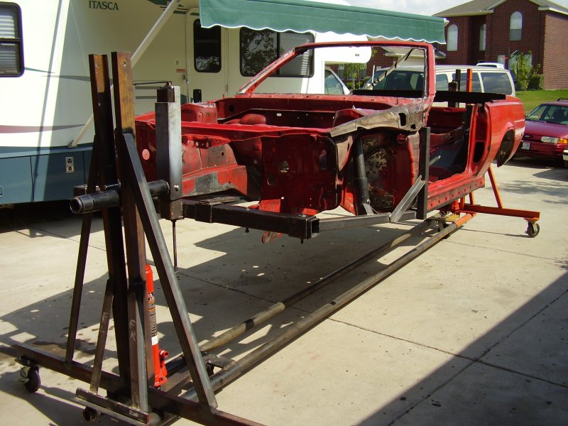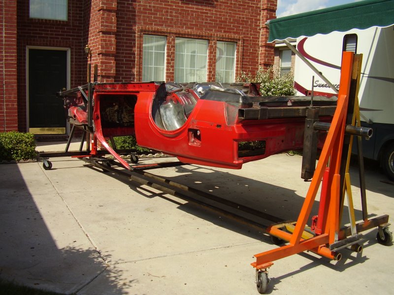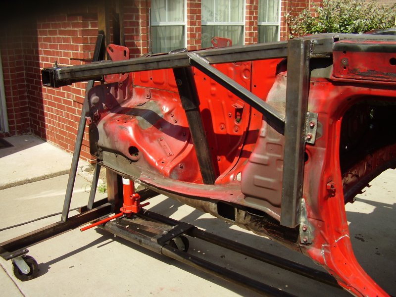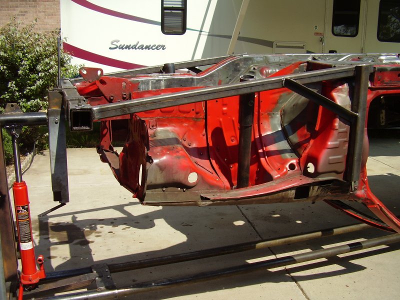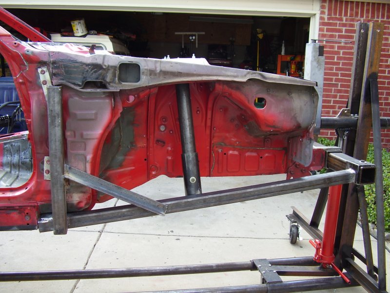 During the Stripping and Dissassembling Process, I noticed that the frame was bent at where the front suspension mounted to the frame. I also noticed where the frame was bent upward where the bumper mounted. I have now constructed a new mounting bracket to hold the car up by the strut tower and the front door posts so that the frame rails and radiator support can be replaced.